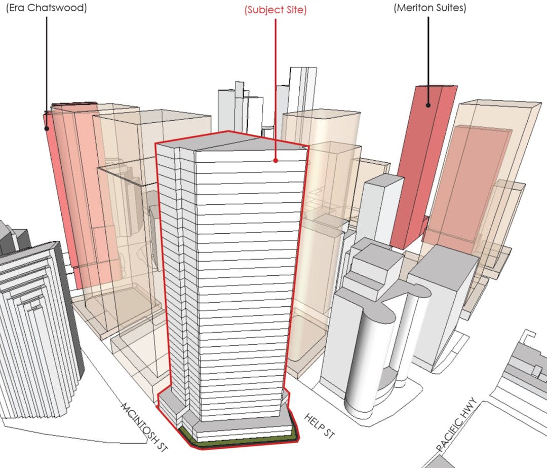 Increase the maximum height of building from 60m at 815 Pacific Highway and 90m at 15 Help Street to 142.8m (RL 246.8m)