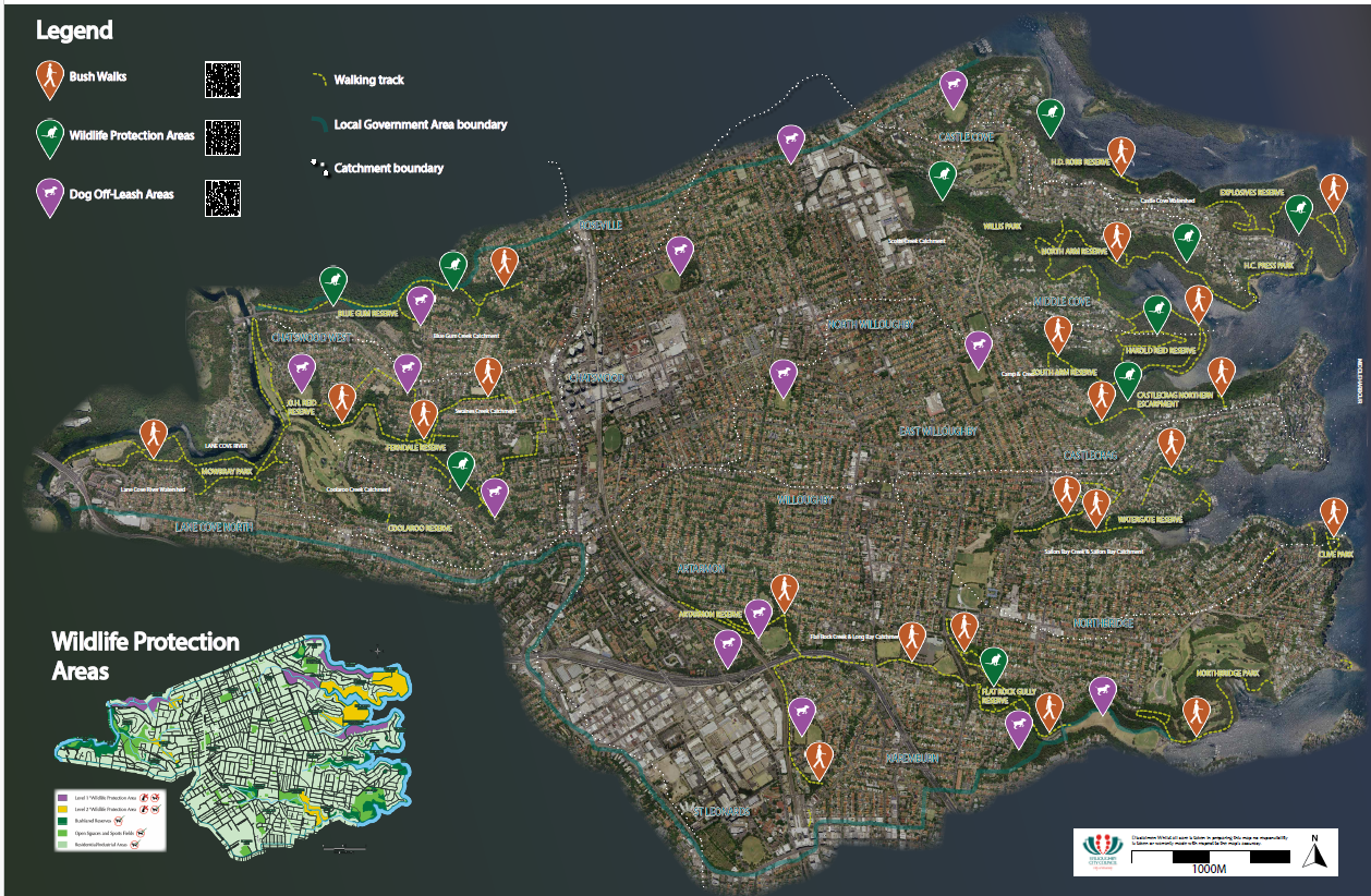 Willoughby City Council has a number of designated dog off leash areas (purple pin in map below) and Wildlife Protection Areas (green pin on map below) where restrictions apply to dog recreation.